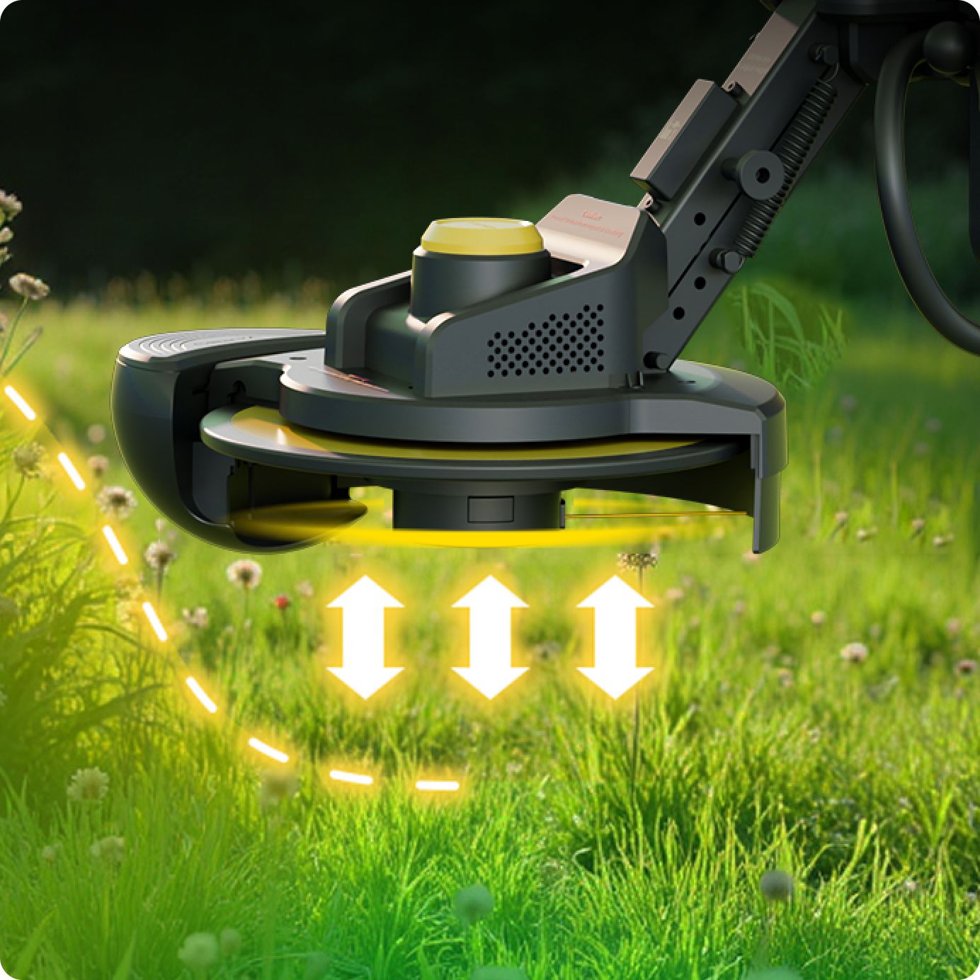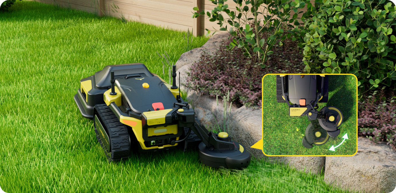 It features flexible trimming lines covered by a protective disc, preventing damage to boundary objects.