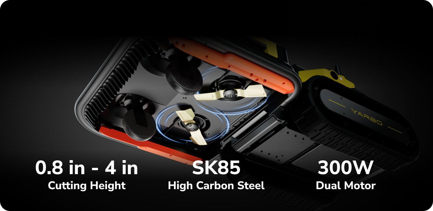 The cutting height range of Yarbo Lawn Mower Pro is adjustable from 0.8 to 4.0 inches (2-10 cm). The ability to cut grass lower is due to the mower's blades being able to press down further. As the grass root becomes denser and thicker, it requires a more powerful mower. With dual 300W motors, Yarbo Lawn Mower Pro is designed to handle this more demanding task with ease.